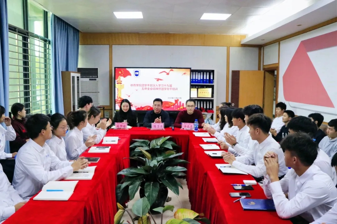 12月22日下午,申博SUNBET团学干部深入学习十九届五中全会精神会议暨团学骨干培训在联谊馆会议室举行。公司党总支陈卫东书记、学工办许达潭主任、兼职辅导员吴梦迪老师出席会议,院团学干部和2020级全体班委参加会议。