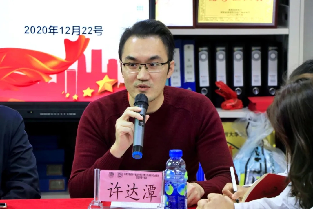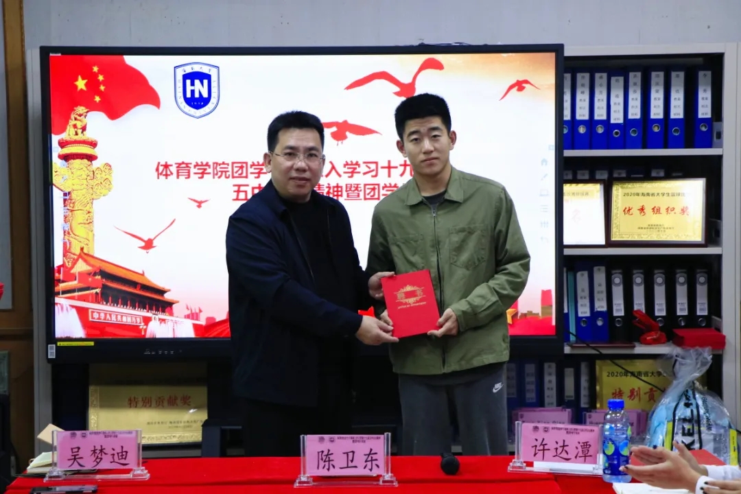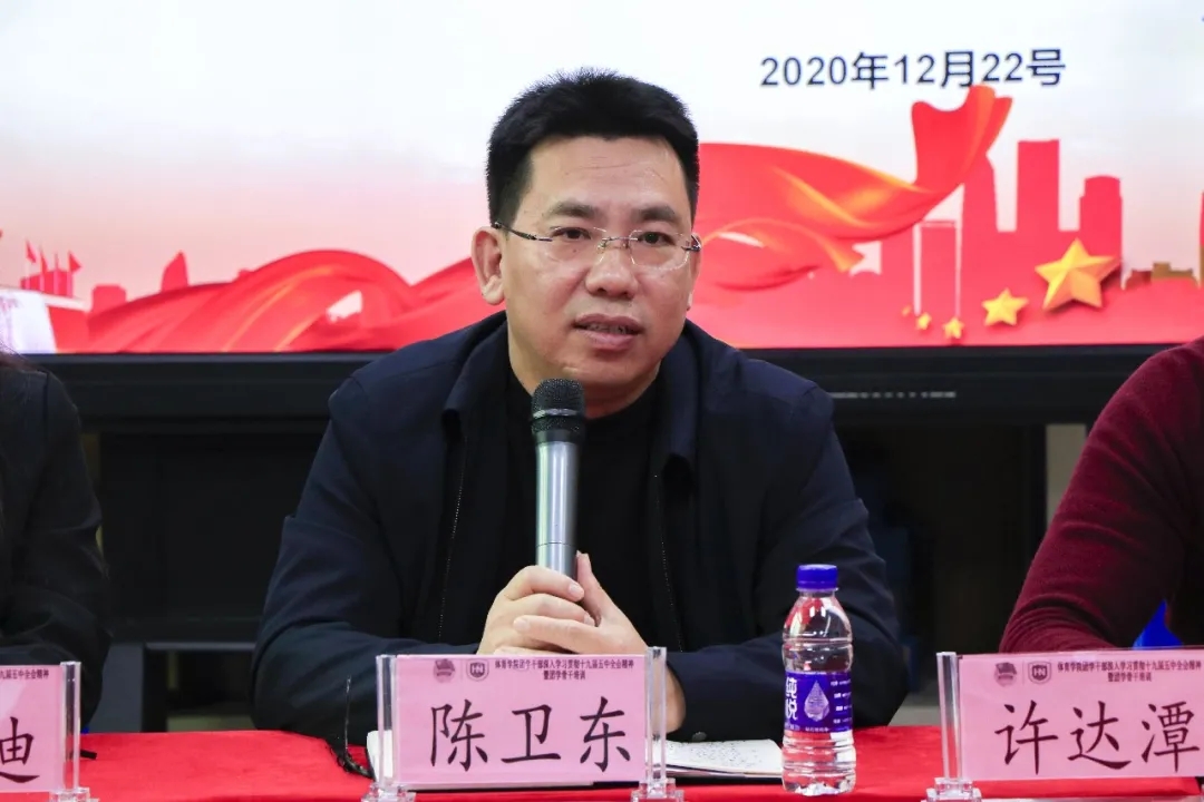 许达潭老师致辞中表示,随着申博SUNBET的成立以及2019年12月共青团申博SUNBET体育部第一次团员大会暨申博SUNBET体育部第一次员工大会的成功召开,实现了员工群团组织从无到有的历史,学院团总支和员工会的建立,标志着学院青年工作开启新的篇章。一年以来,在公司党总支的领导和校团委的指导下,在学院领导的大力支持下,在全体团干、团员及广大师生的共同努力下,基层团建、思想引领、专业实践、志愿服务和校园文化建设等方面的工作取得了一定成绩,这其中,第一届团学干部们发挥了重要作用,许老师代表院团总支对大家的付出表示感谢。同时,要坚持立德树人,团结带领广大团员青年为推进申博SUNBET建设“双一流”高校,促进海南自贸港建设贡献青春力量,未来的工作任重道远,希望新一届团学干部能接过前辈的接力棒,再接再厉创造体院美好明天。
