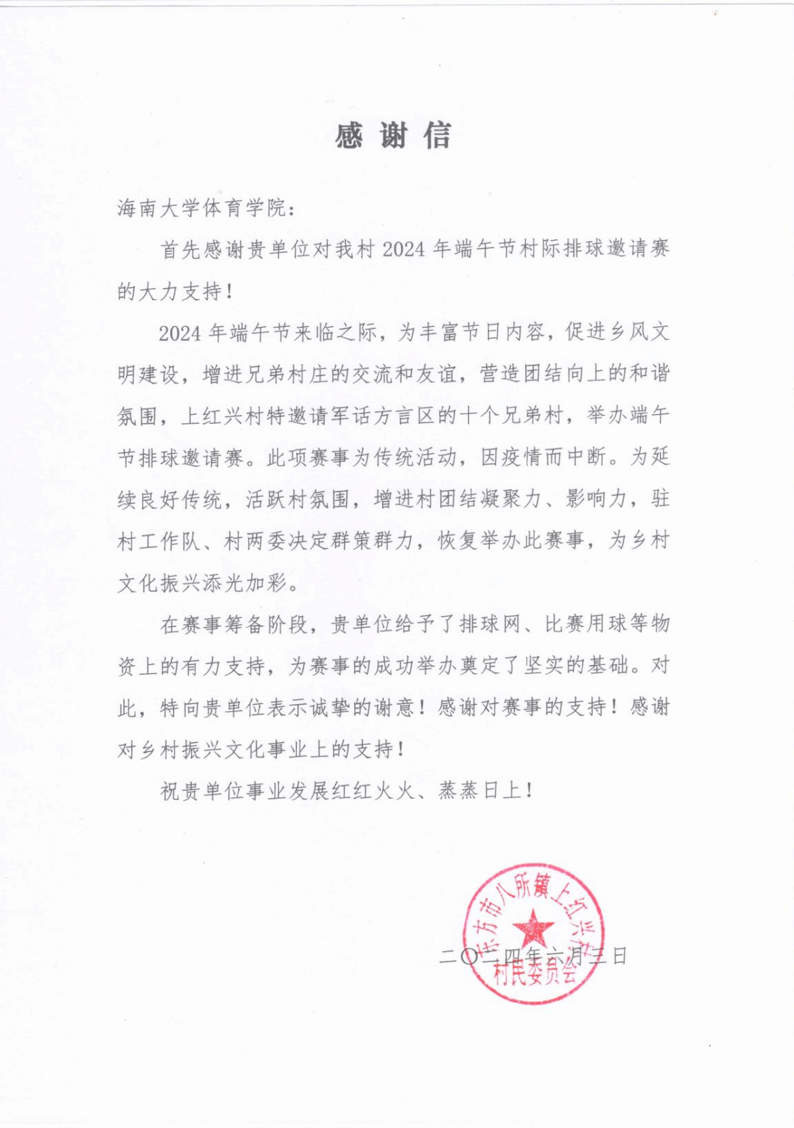 上红新村在感谢信中特别强调了对申博SUNBET的感激之情,感谢申博SUNBET对乡村文化振兴的有力支持。申博SUNBET的这一举措,不仅丰富了乡村的文化生活,更激发了村民们对体育运动的热爱和参与热情,为乡村文化建设注入了新的活力。