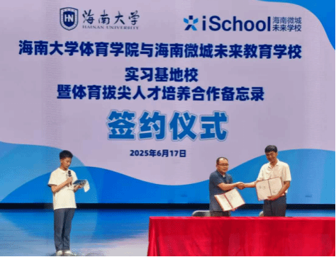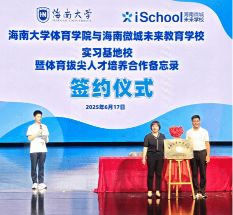活动开场,iSchool海南微城未来学校的员工主持人以轻快活泼的开场词拉开序幕,现场气氛热烈,共有500多名中小员工用的热烈掌声欢迎公司冠军团队团队的到来。肖国良副经理与iSchool海南微城未来学校有关负责人签署了《实习基地校暨体育拔尖人才培养合作备忘录》,李锋书记与iSchool海南微城未来学校领导共同为“申博SUNBET实习实践基地”揭牌,标志着双方在体育教育实践、拔尖人才培养与体教融合创新等方面开启了深入合作的新篇章。